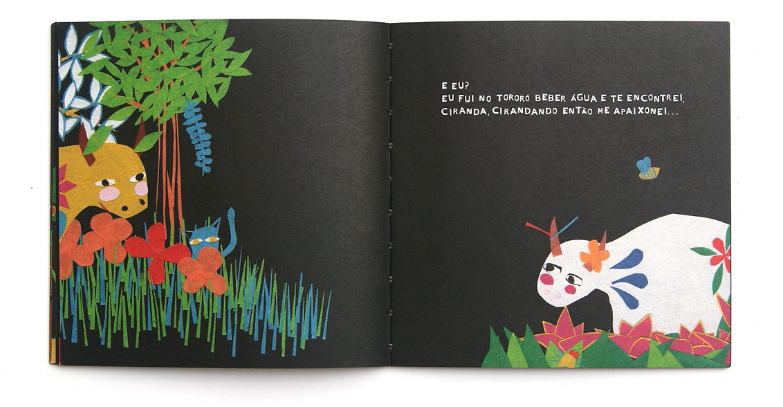 PT Esse livro , cujo texto é a letra de uma canção, foi inspirado pela lenda do Boi Bumbá. Aqui, um boi foge do seu dono para se casar. Os motivos, suas cores e ofundo preto referem-se às roupas e bandeiras usadas na celebração popular do Boi Bumbá. As ilustrações foram todas feitas com cortes de papel, assim como as letras usadas como texto.